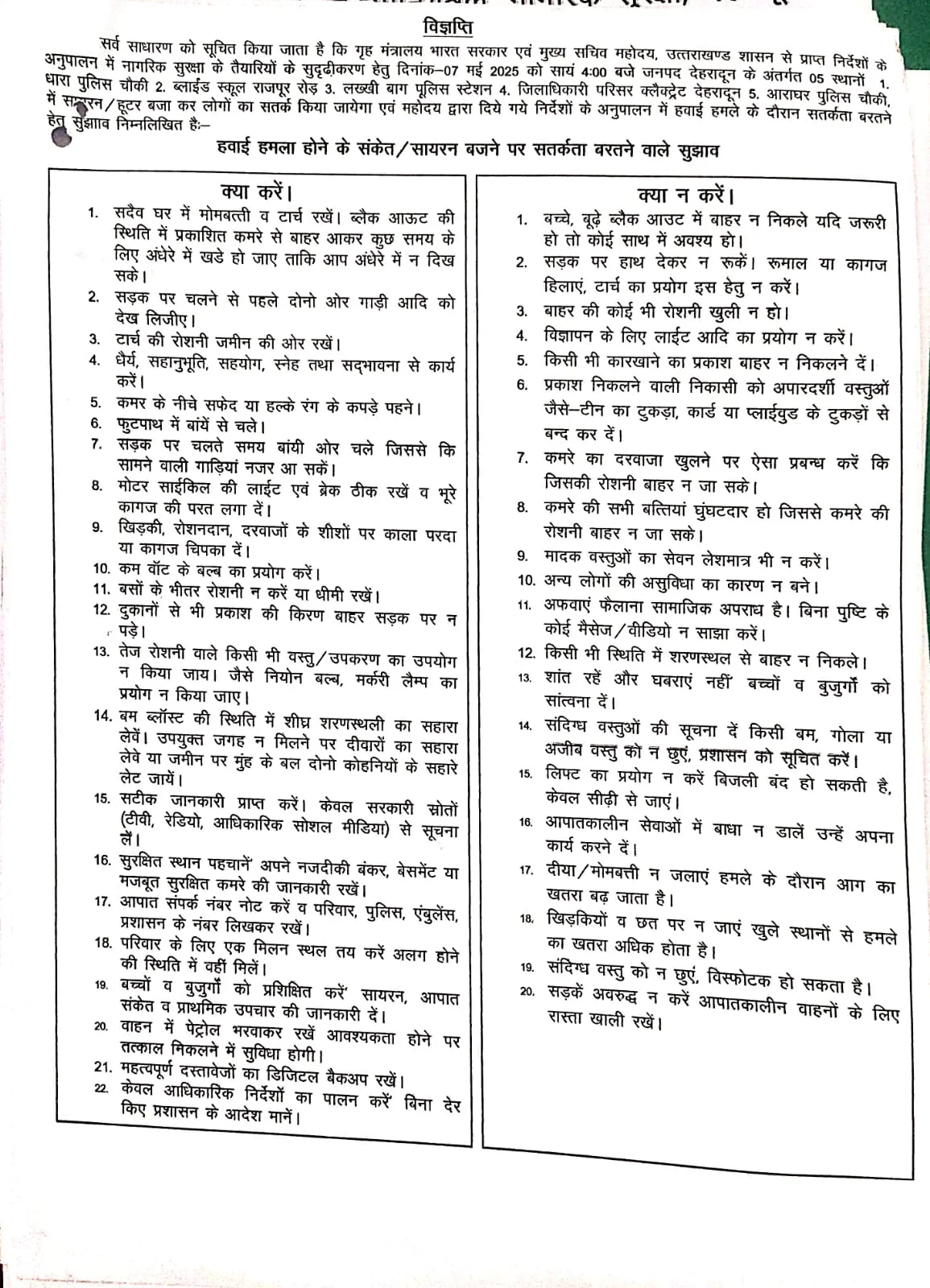 देहरादून में 24 अप्रैल को एयर रेड/ब्लैकआउट मॉक ड्रिल, रात 10:05 बजे 30 मिनट का अंधेरा