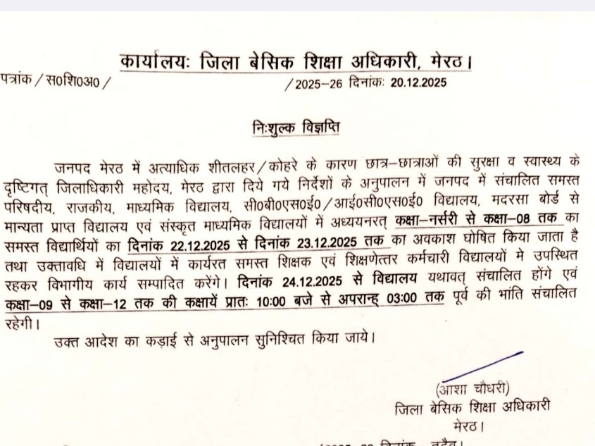 मेरठ में स्कूलों की छुट्टी: भीषण ठंड और कोहरे का कहर, कक्षा 8 तक 22 और 23 दिसंबर को बंद रहेंगे विद्यालय