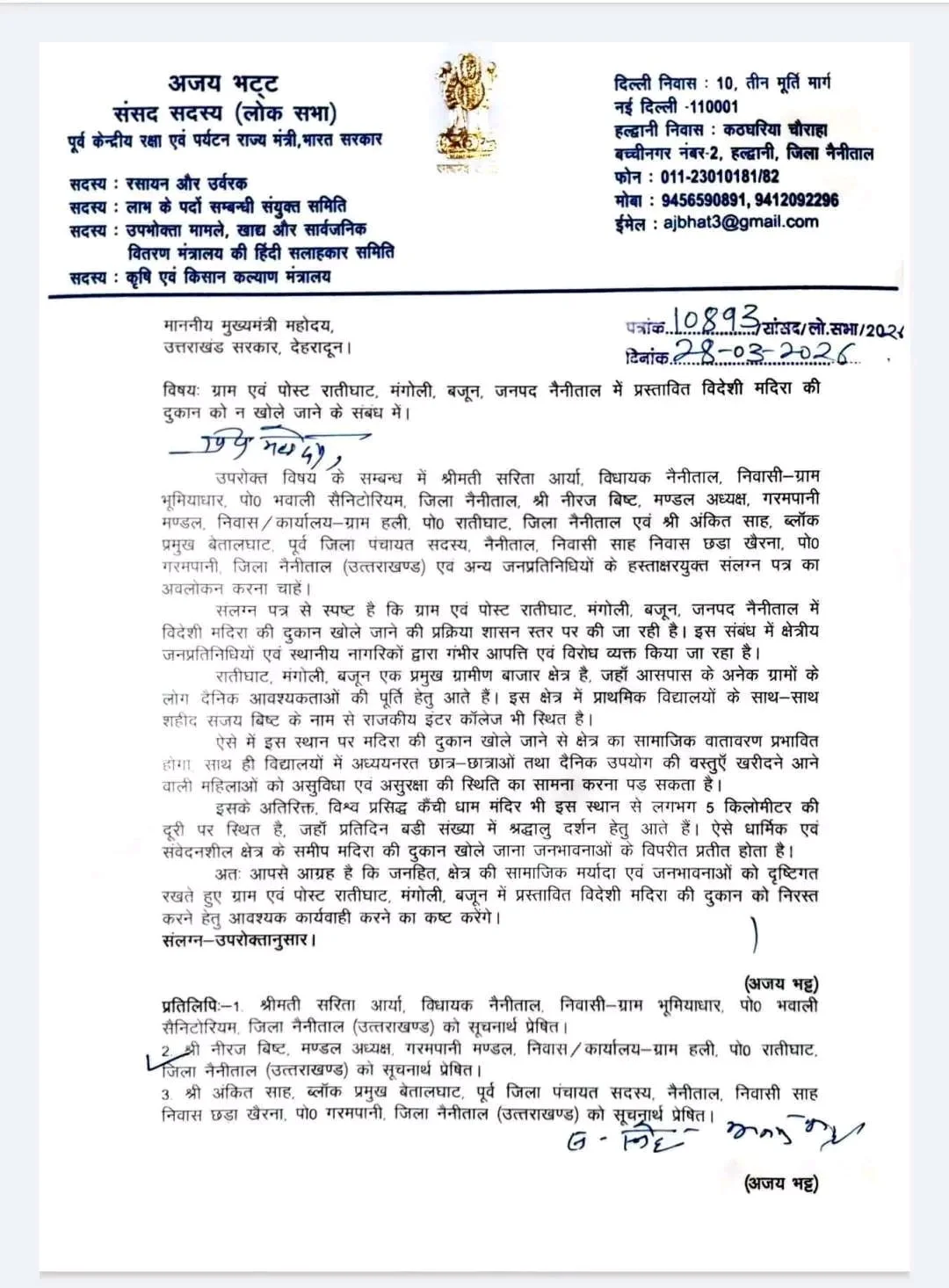 नैनीताल जिले के रातीघाट, मंगोली और बजून क्षेत्रों में नई शराब की दुकानों के प्रस्ताव का स्थानीय स्तर पर विरोध हो रहा है। खासतौर पर कैंची धाम जैसे प्रसिद्ध धार्मिक स्थल के समीप दुकान खोले जाने को लेकर लोगों में नाराज़गी है। इस विरोध में अब आम जनता के साथ-साथ क्षेत्र के सांसद अजय भट्ट भी खुलकर सामने आ गए हैं।